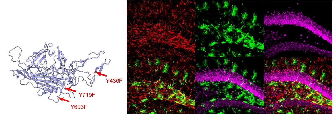 自2016年起,研究团队在瓦力游戏官方研究员徐富强和王杰的带领下,联合磁共振成像与病毒基因改造技术率先提出一种新型基因编码生物磁共振成像技术,逐步实现神经元网络(Neuroimage, 2019; Human Brain Mapping, 2021)和星形胶质细胞(Molecular Psychiatry, 2022)在体水平的无创检测。其中,rAAV是近年来开展极为迅速的一类工具病毒,是研究神经科学相关问题和基因治疗的重要载体。团队第一时间对rAAV工具病毒的衣壳蛋白进行突变改造,并利用人类胶质纤维蛋白的启动子GFAP构建rAAV载体,提升了病毒工具在星形胶质细胞的转导效率(图2)。