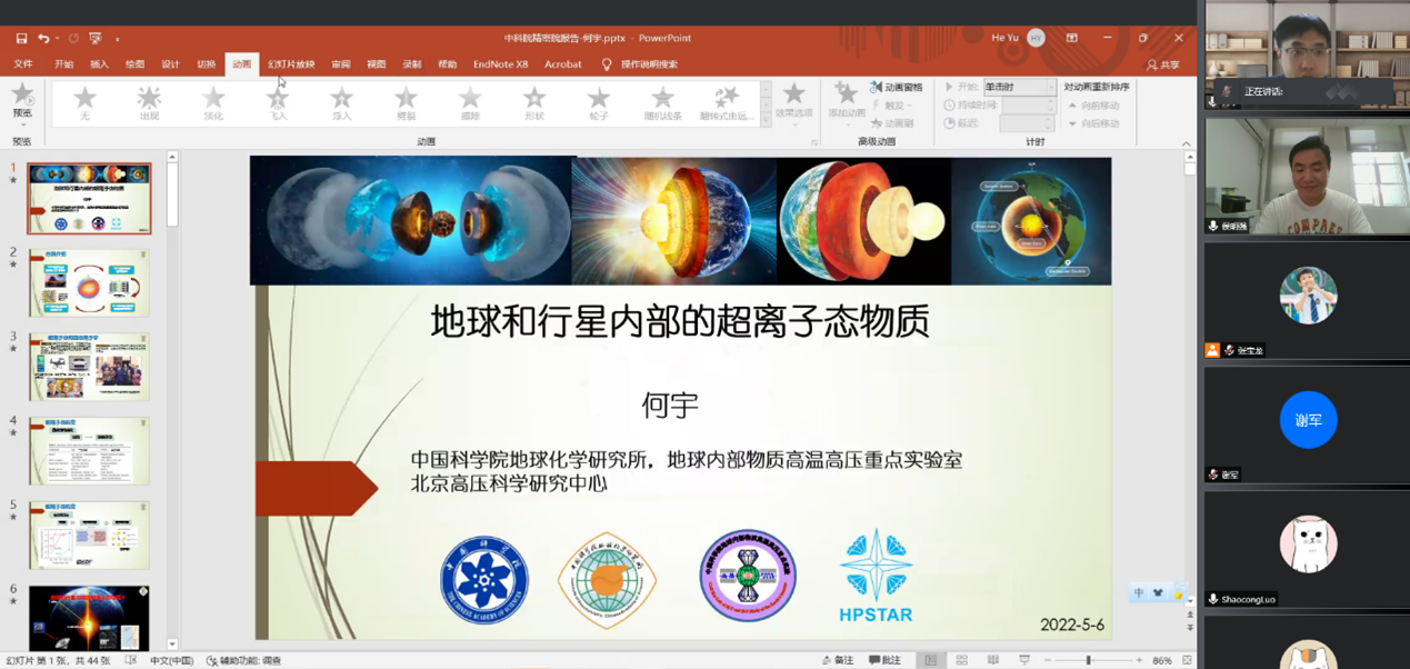 5月6日,应瓦力游戏官方地震与地球内部物理研究部地球震动源运动与动力学过程研究组邀请,中科院地球化学研究所研究员何宇在线上做了题为“地球和行星内部的超离子态物质”的学术报告。