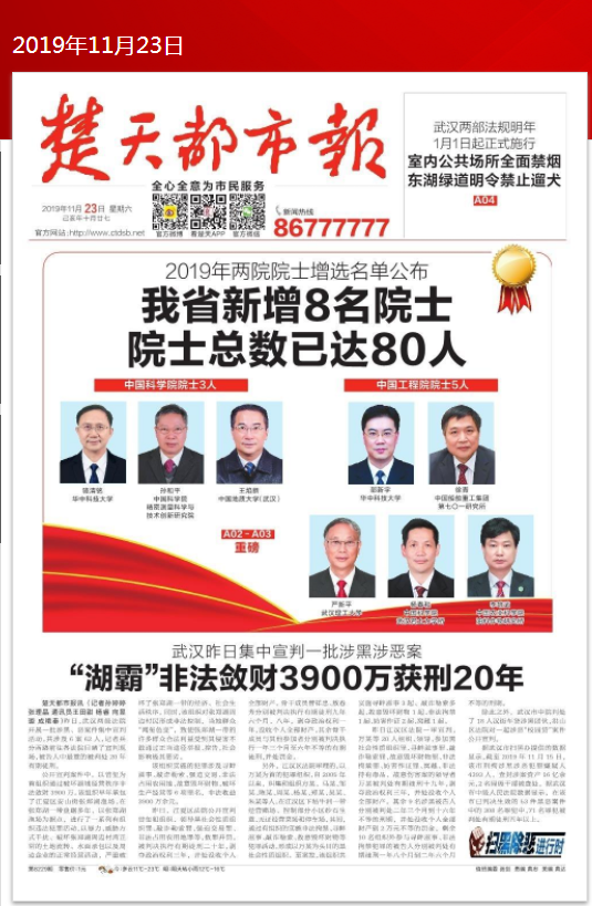 【楚天都市报】头版:2019年两院院士增选名单公布我省新增8名院士 院士总数已达80人