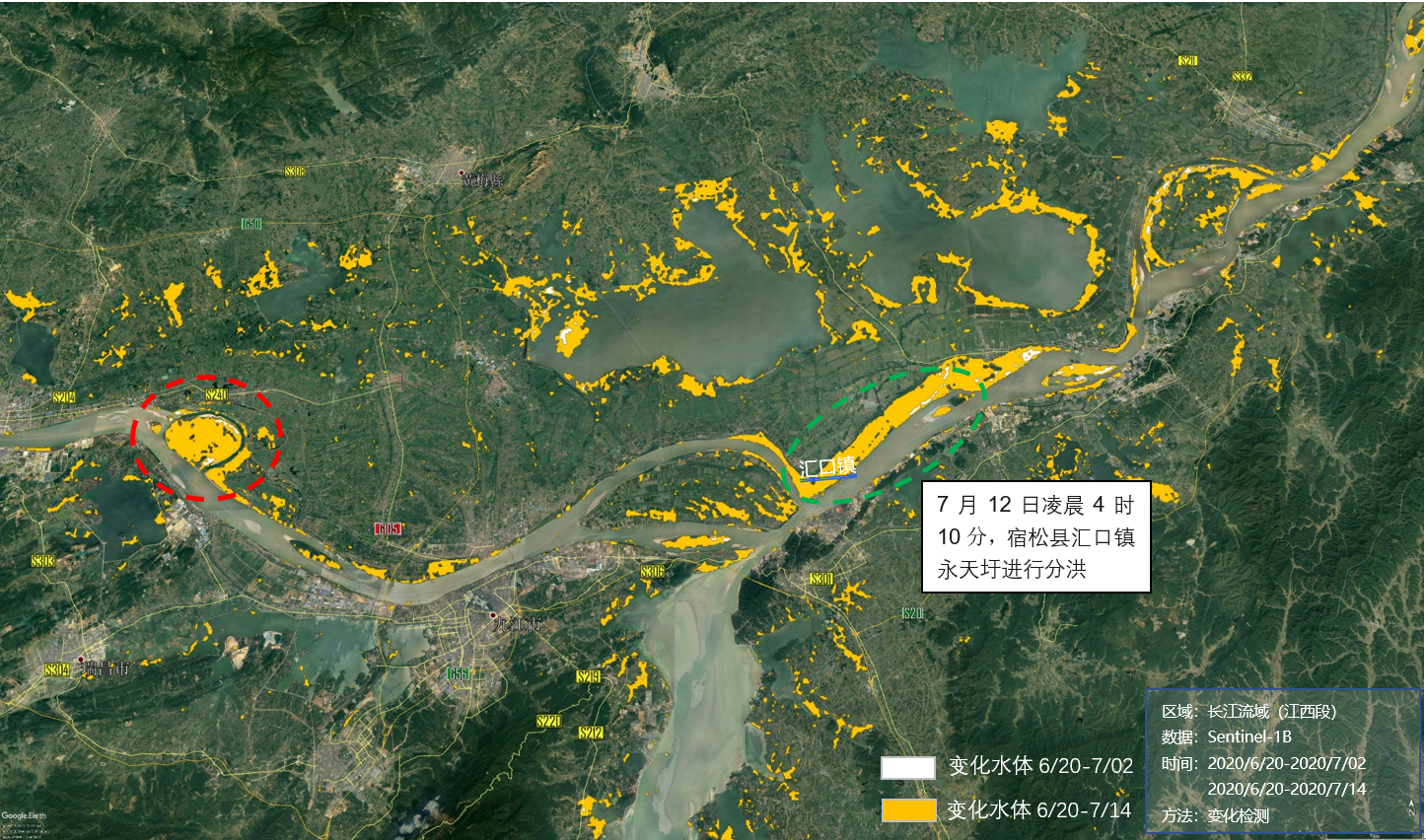 3 长江流域(江西段)水情变化(2020/6/20-2020/7/02, 2020/6/20/-2020/7/14)。背景:google earth