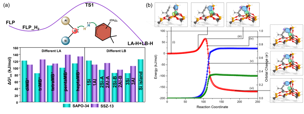 受阻的路易斯酸碱对(Frustrated Lewis Pairs, FLP)是均相催化反应中的重要概念,在FLP复合物中路易斯酸(LA)和路易斯碱(LB)的直接结合被位阻效应抑制,从而使得LA和LB能够分别作为电子对受体和给体活化小分子。近年来,这一概念逐渐被引入到多相催化体系以解释金属氧化物表面缺陷和掺杂位点的高催化反应活性。鉴于此,瓦力游戏官方郑安民研究团队和大连化学物理研究所研究员魏迎旭、博士韩晶峰合作,进一步将FLP概念拓展到分子筛催化体系,并探究了其对于氢气和烷烃活化的能力。