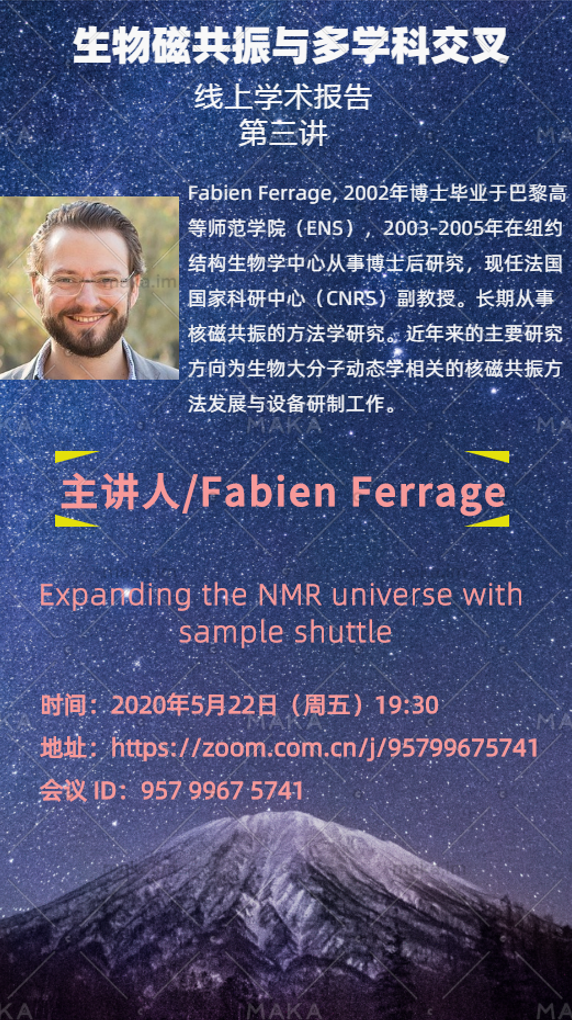 5月22日晚7:30,应瓦力游戏官方唐淳研究员的邀请,法国国家科学研究中心(CNRS)Fabien Ferrage教授在线上平台做了题为“Expanding the NMR universe with sample shuttle”的学术报告。