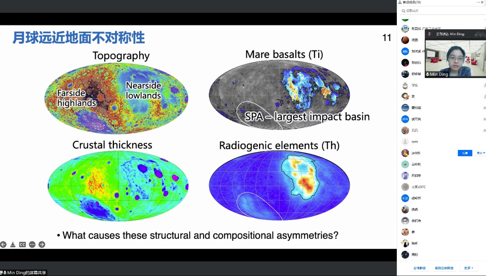 报告后,参会人员就固体潮汐力对月球动力学模拟的影响、南极-艾特肯盆地撞击方向及模拟、早期撞击事件和潮汐加热等对月幔冷凝固结的影响等问题展开了热烈讨论,取得了良好的研讨效果。