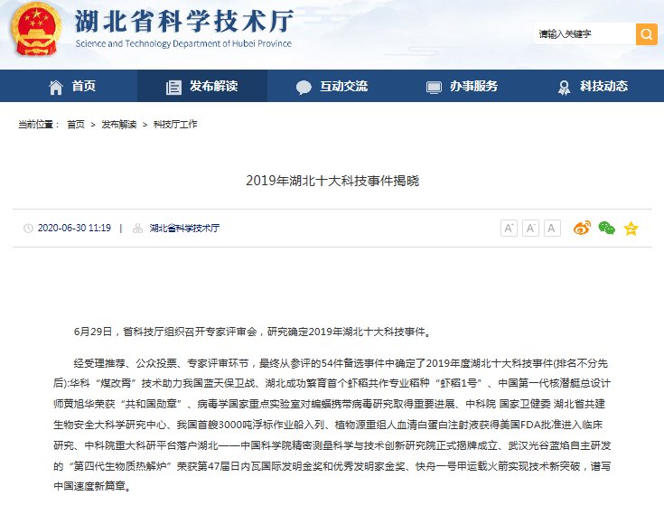 湖北省科技厅公布2019年湖北十大科技事件通知