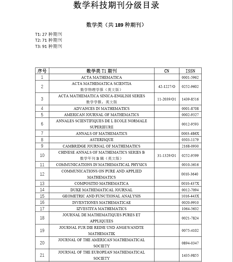为深入贯彻落实中国科协、中宣部、教育部、科技部《关于深化改革培育世界一流科技期刊的意见》,有助于中外科技期刊同质等效,吸引高水平论文在中国科技期刊首发,加快推进世界一流科技期刊建设,根据中国科协统一部署,中国数学会承担了中国科协“发布我国数学领域高质量期刊分级”工作。数学领域高质量科技期刊分级目录的试点成果自2021年1月24日公示以来,受到了社会各界的广泛关注。2021年4月,中国数学会组织专门的具有广泛代表性的专家委员会召开工作会议逐条充分讨论公示期收到的意见,并对数学期刊分级进行了适当的调整。调整后的期刊分级目录经2021年中国数学会常务理事会审定调整顺利获得后按要求公布。